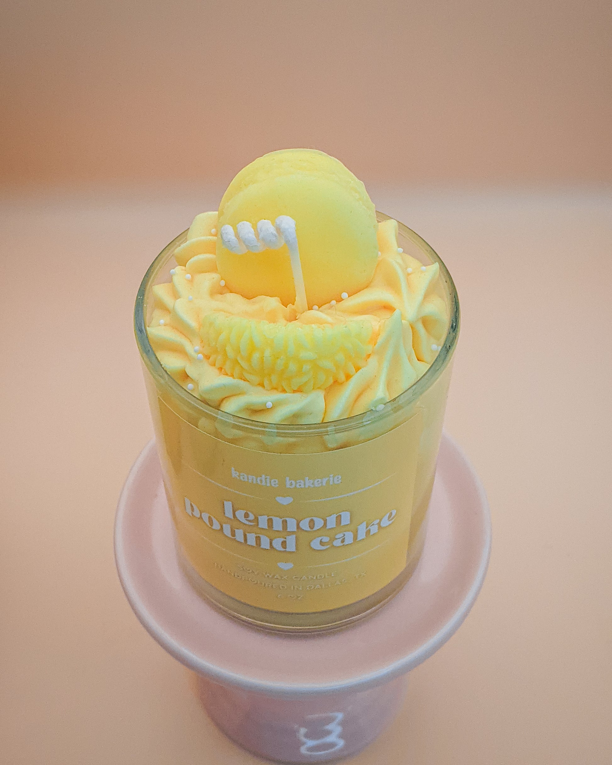 Indulge in the dreamy scent of lemon pound cake topped with a yellow macaron and lemon.
